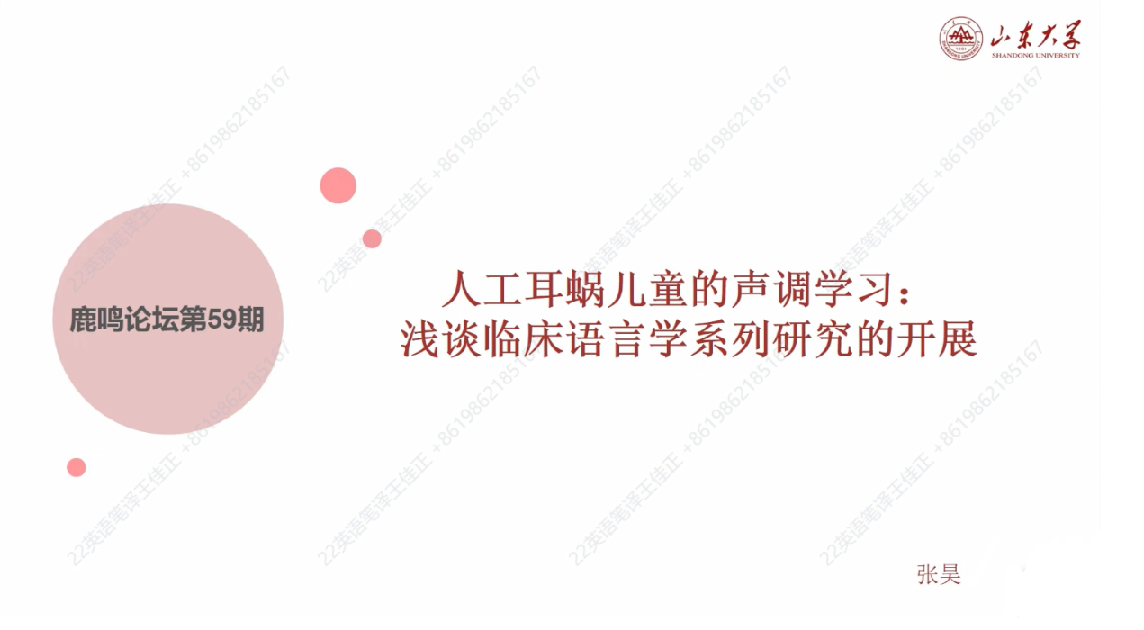 6月1日晚,yh533388银河外国语应用英语系张昊副教授应邀主讲yh533388银河2023年第59期“鹿鸣论坛”,通过腾讯会议线上平台作了主题为“人工耳蜗儿童的声调学习: 浅谈如何开展系列研究”的学术报告。本次讲座由yh533388银河武震副教授主持,来自校内的100余名师生共同参与了本次讲座。