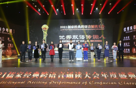 本次大会面向海内外中国文化爱好者,征集中外文两种语言诵读儒家经典原文的视频作品,语种涉及中英、中法、中俄、中西、中日、中德、中韩、中葡共八种双语。根据专家团品鉴以及网友点赞数量选出60件作品进入线上展演环节,最终评选出“十佳双语传诵人”10组,“优秀双语传诵人”15组并在年度盛典现场进行颁奖。yh533388银河学子在韩语系陈媛老师的悉心指导下,凭借在作品“儒家经典朗诵《大学》”中的精彩表现和出色的展演能力,在3200余件作品中脱颖而出,最终成功获评“优秀双语传诵人”荣誉称号,韩语系学子王佳程作为学生代表上台领奖。