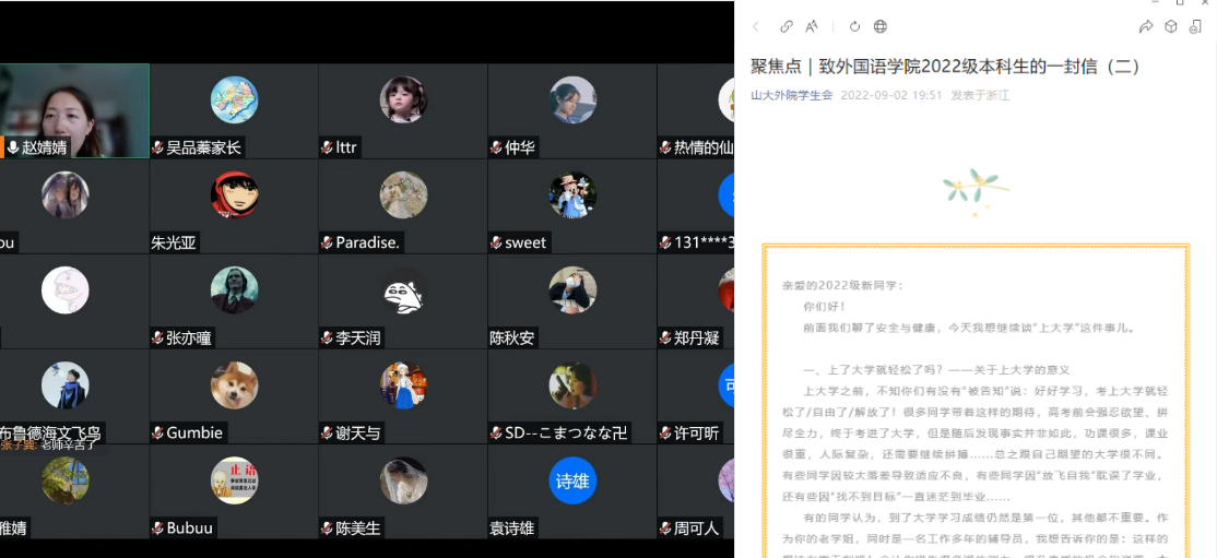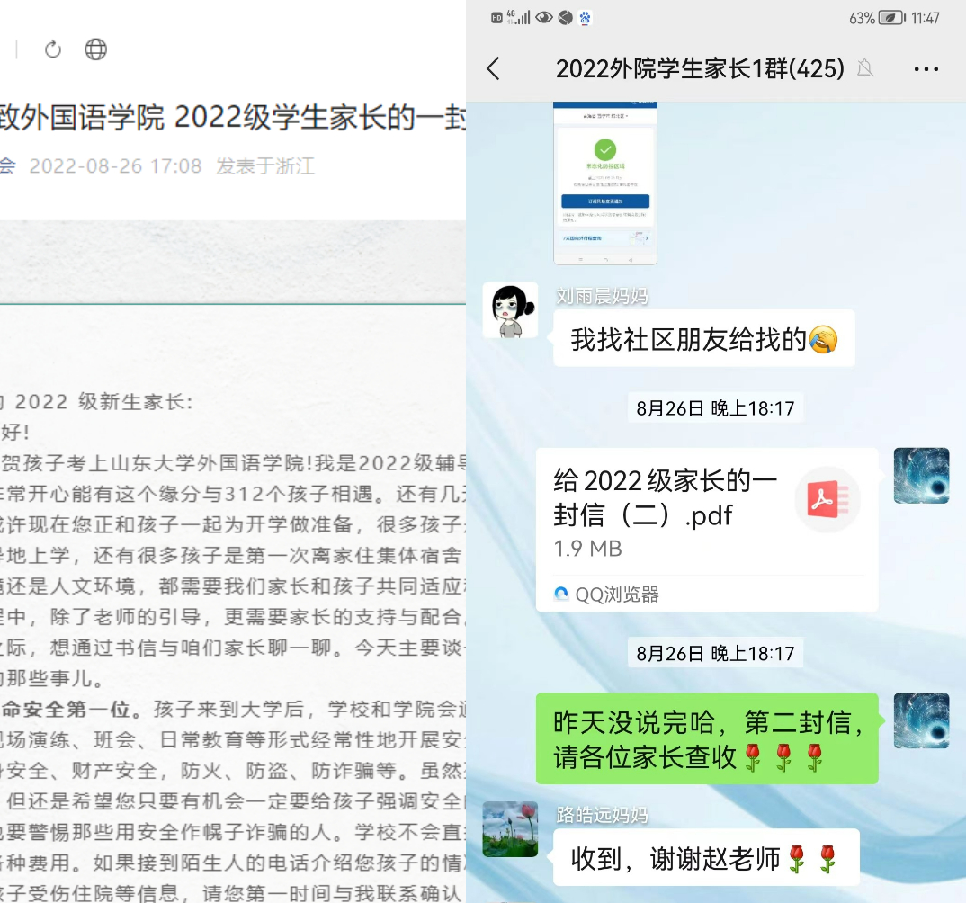 搭建家校合作平台。建立近400余人的新生家长微信群,及时传达学校、学院相关的通知,并解答有关疫情防控政策、新生报到流程、校园生活、专业分流等问题;组织召开线上家长会,辅导员与家长云见面,了解家长诉求,增强家校交流;在公众号发布了“致2022级学生家长的一封信(一)(二)”,从安全与健康、大学生亲子关系等方面给学生家长提供建议。