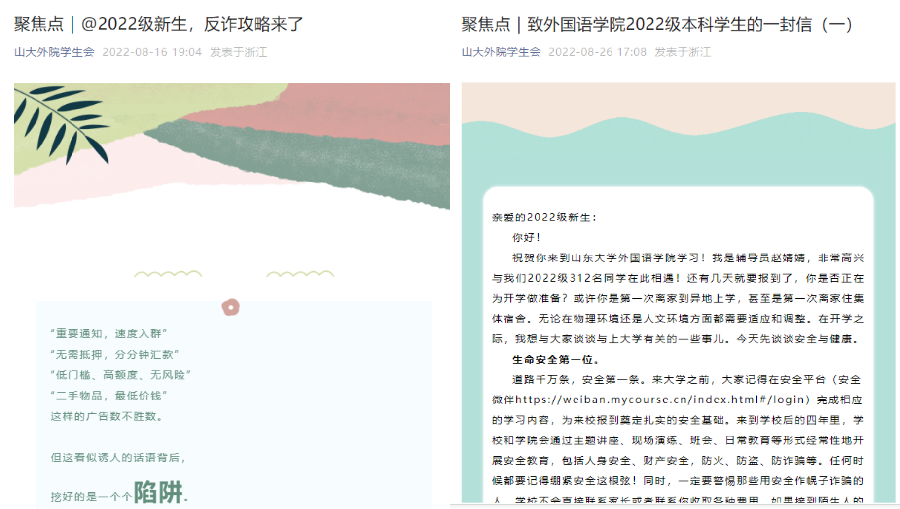 提升安全健康意识。学院通过微信公众号发布了“新生指南之防骗攻略”,“辅导员致学生的一封信”,从安全意识树立、安全知识学习、疫情防控事项、自我健康管理、心理健康维护等方面引导新生加强安全防范意识,掌握防诈技能,了解健康管理知识。