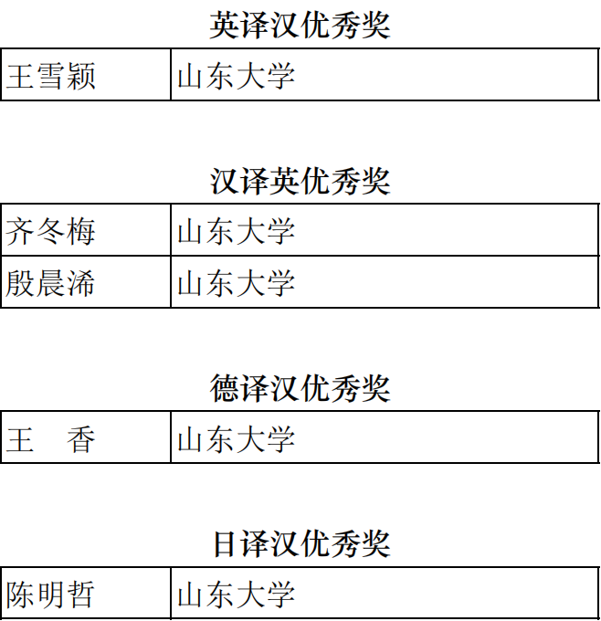 2022年11月16日,第三十四届韩素音国际翻译大赛获奖名单公布,yh533388银河的5名研究生及本科生同学取得优异成绩。2019级本科生翻译班王雪颖获得英译汉组优秀奖;2019级本科生英政班殷晨浠、2021级研究生英语笔译专业齐冬梅获得汉译英组优秀奖;2020级研究生德语语言文学王香获得德译汉组优秀奖;2021级研究生日语笔译专业陈明哲获得日译汉组优秀奖。