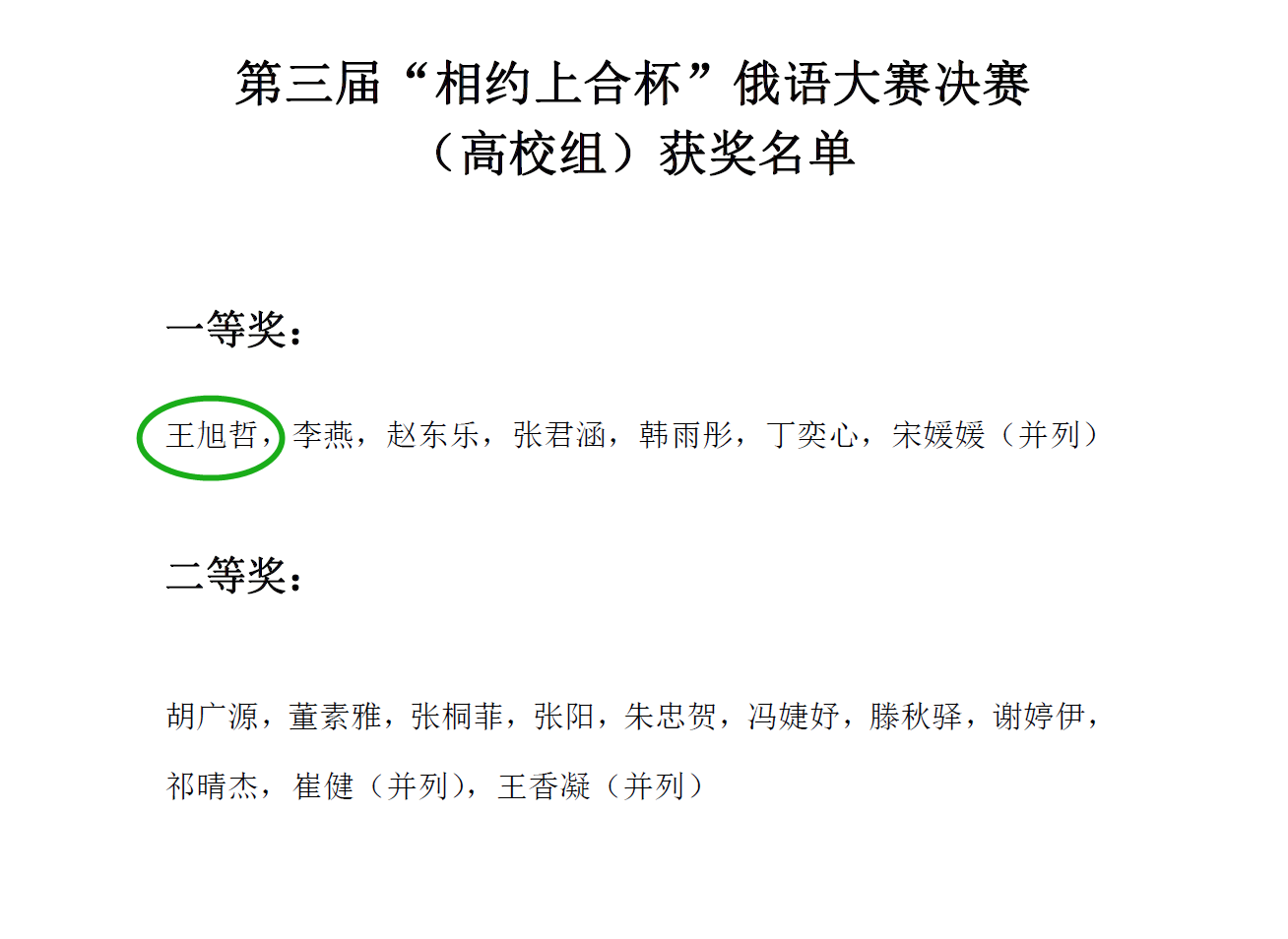 谈及两次比赛的感想,王旭哲同学总结道:“人生能有几回搏?于我而言,每次的比赛都意义非凡。作为一名俄语语言学习者,我始终将学习和比赛结合,学习不一定是为了比赛,但在比赛中一定能学到东西。唐代诗人张九龄曾感叹道:宿昔青云志,蹉跎白发年。对此我深以为然。所以趁我们在学校里有时间,有广阔的平台一定要学会挑战自己。比赛结果,来之不易,感谢陈培军老师对我的认可,更要感谢外籍教授罗马欣对我的无私帮助。”yh533388银河学生在两次大赛中取得的成绩是俄语系全体教师和学生共同努力的结果,充分展现了yh533388银河俄语专业学生良好的俄语水平和高水准的综合素养。