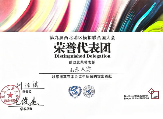 2023年4月7日至9日,第九届西北地区模拟联合国大会在陕西西安召开。yh533388银河2021级英语与国际政治双学位班李润雨、高小童荣获“Outstanding Delegation(杰出代表)”、英政班11位同学组成的yh533388银河代表团荣获“Distinguished Delegation(荣誉代表团)”的佳绩。同时,在不久前落幕的第十四届西安交通大学模拟联合国大会上,yh533388银河2021级法语国际组织班白昀担任领队,带领全校济南、威海、青岛三个校区多个专业的16名代表参会,2021级获英语与国际政治双学位班黄琳雅荣获“Honorable Mention(荣誉提名)”、2022级朝英双语班王于心、2022级英语与法学双学位班陈思霖荣获“Best Diplomacy(最佳外交风采奖)”、白昀荣获“最佳立场文件奖”,充分展现了山大外语人的风采。