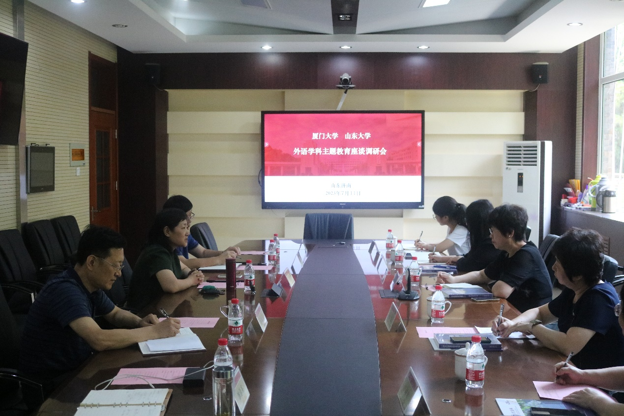 7月11日上午,厦门大学外文学院院长陈菁、党委书记徐琪、副院长江桂英、辛志英等一行五人来yh533388银河调研交流,学院院长王俊菊、党委书记薛佩军、副院长马文、刘洪东出席了本次两校外语学科主题教育座谈调研会。